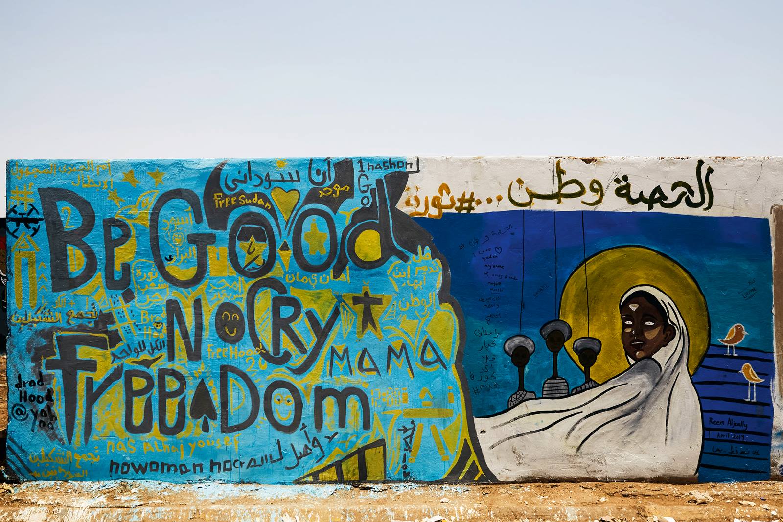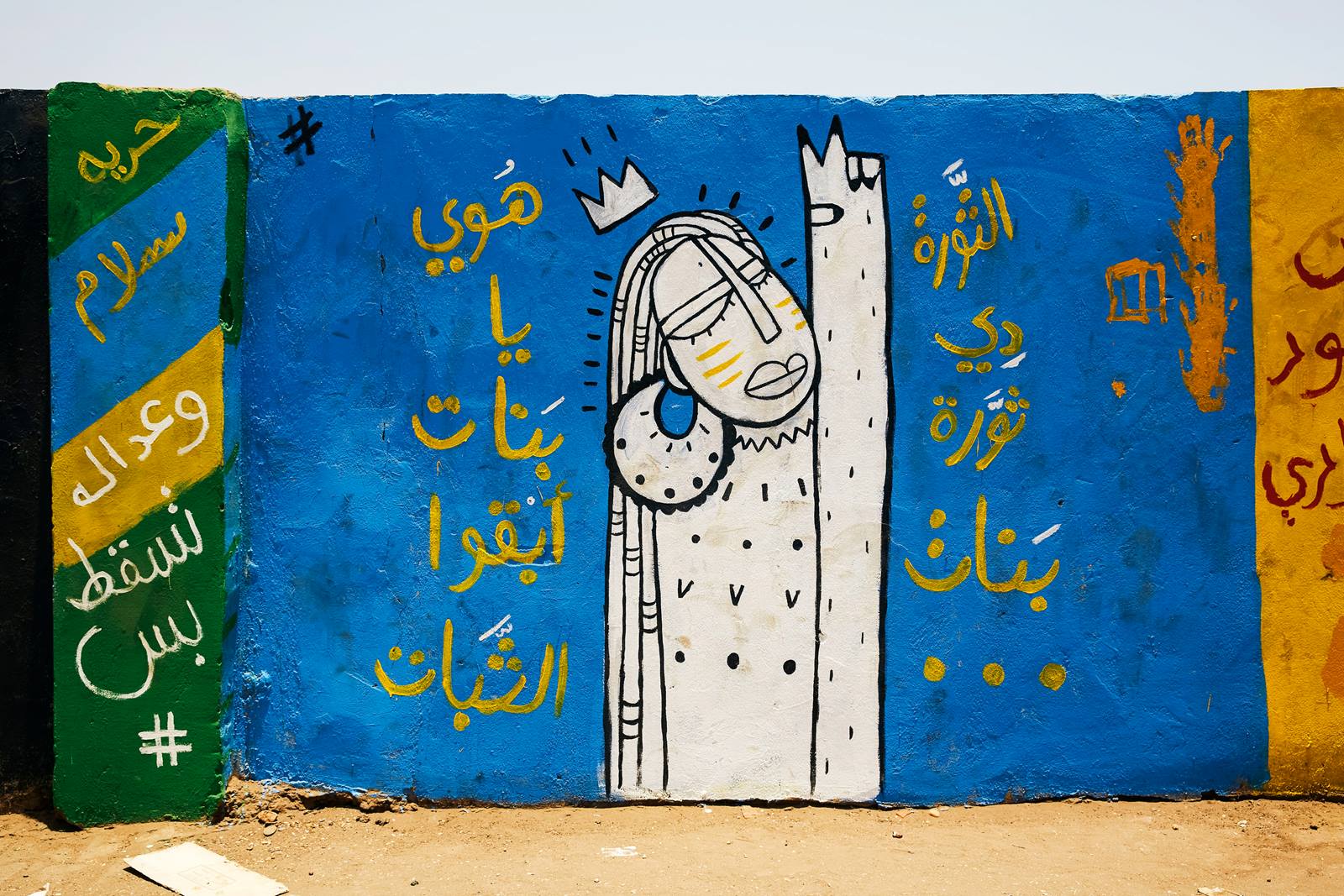 Det vægmaleri, hun gik i gang med, tog over tre timer at lave. Det forestiller en ”kendaka” – en nubisk dronning, der er symbol på stærke sudanesiske kvinder – og bærer et populært protestslogan: "Damer, stå fast. Dette er en kvinderevolution".