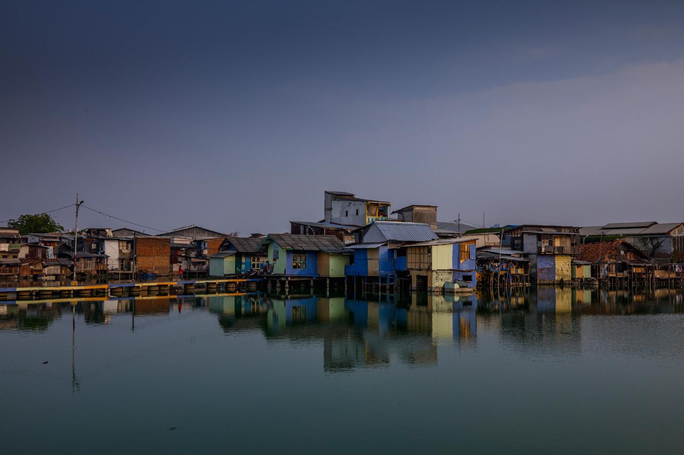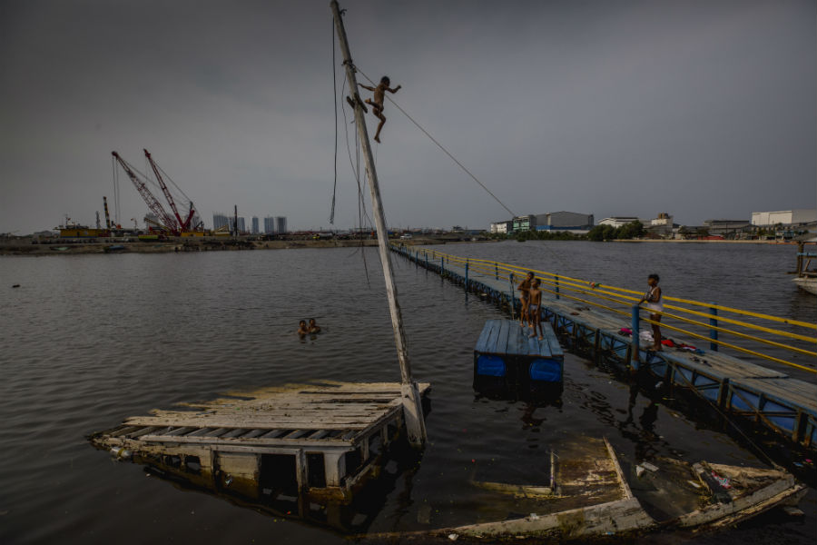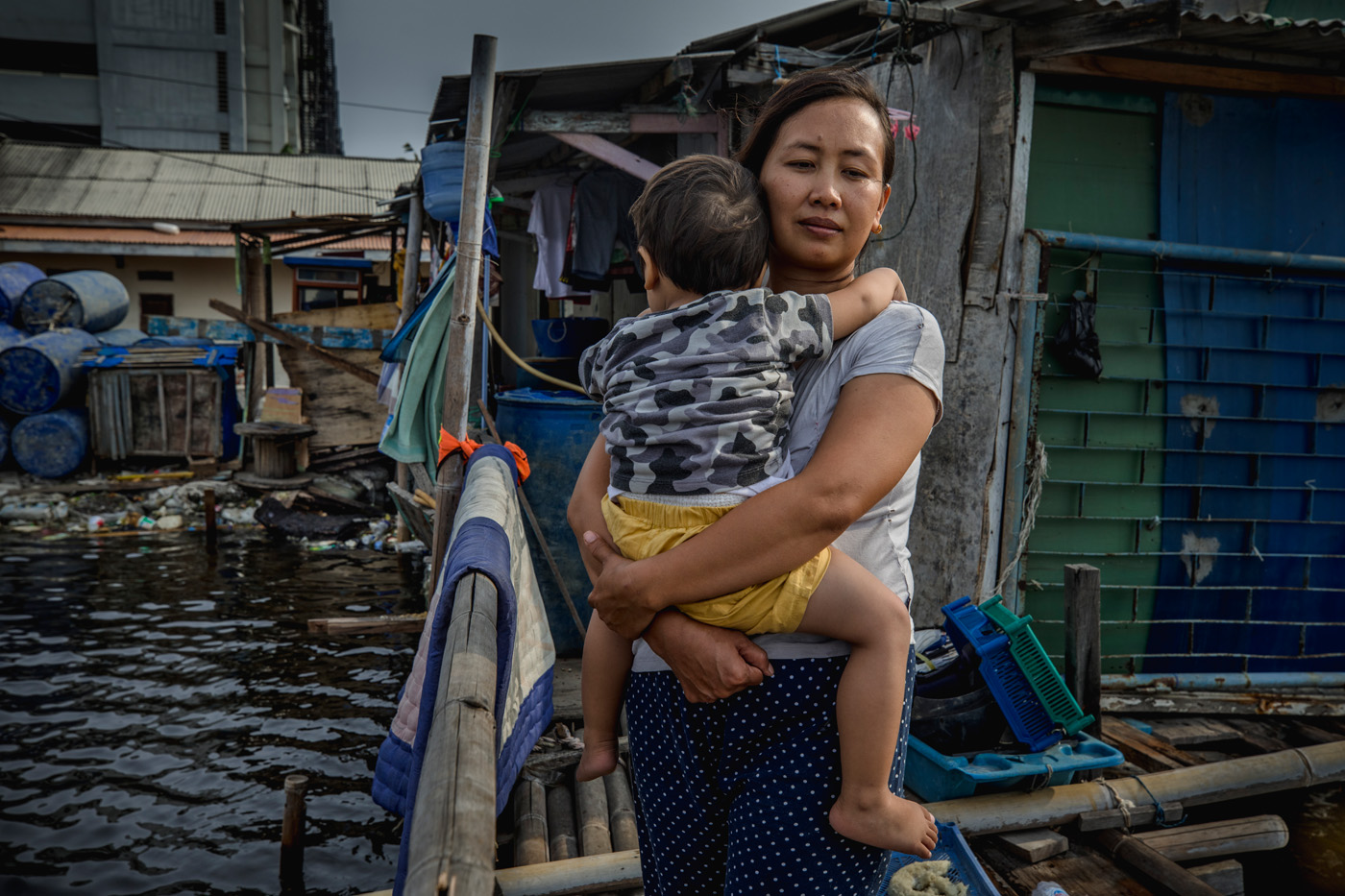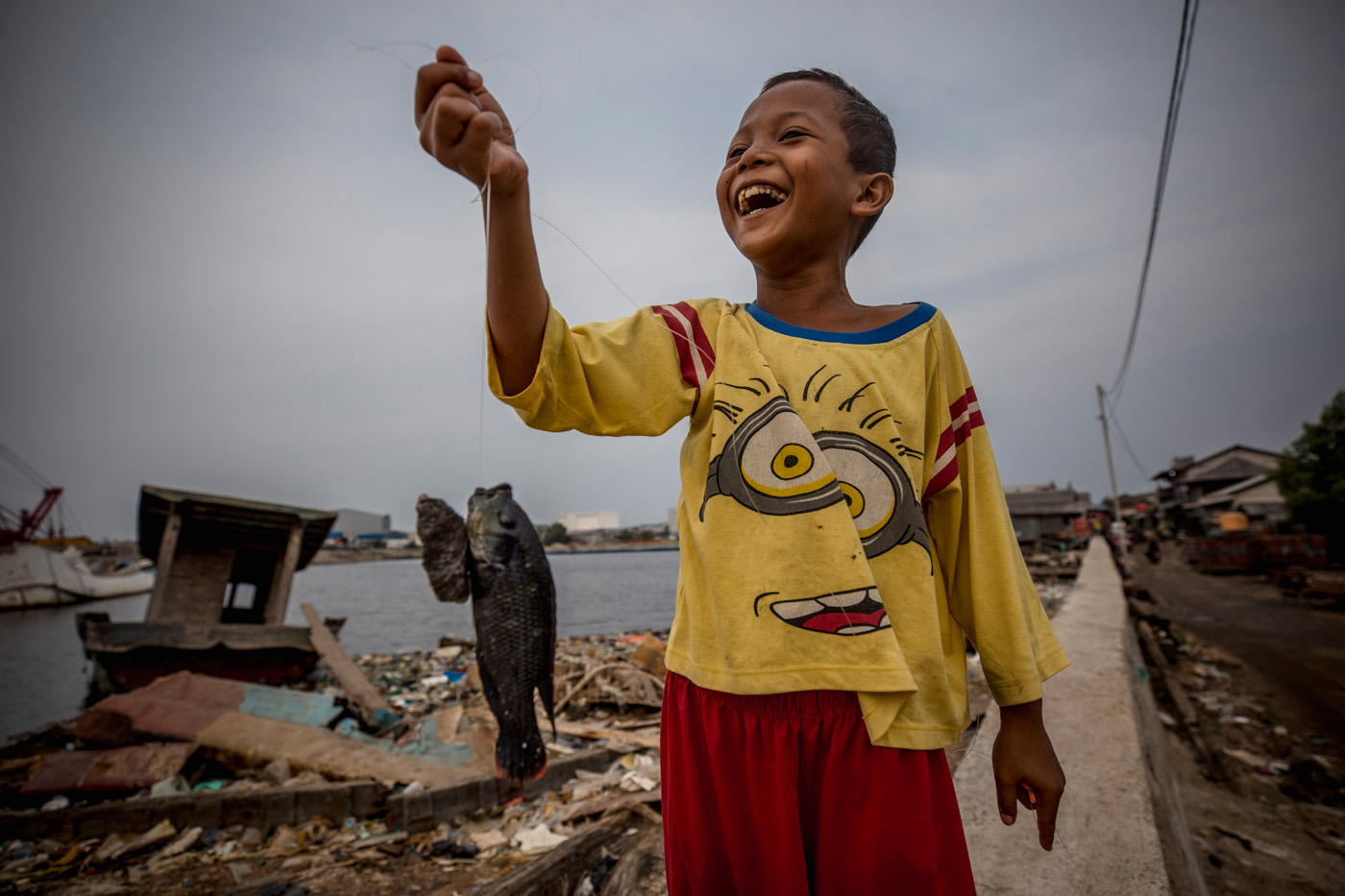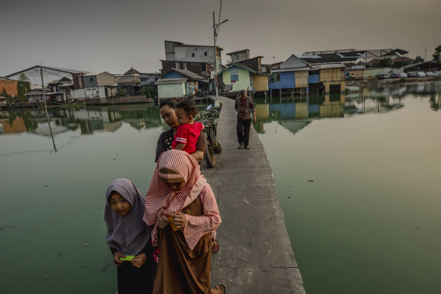 I det nordlige Jakarta ligger slumområdet Muara Angke. Op mod havnekajen, hvor arbejdere fra miljønævnet fisker plastik op med garn, er en fire meter høj grå cementmur blevet rejst for at beskytte mod havets fremmarch.