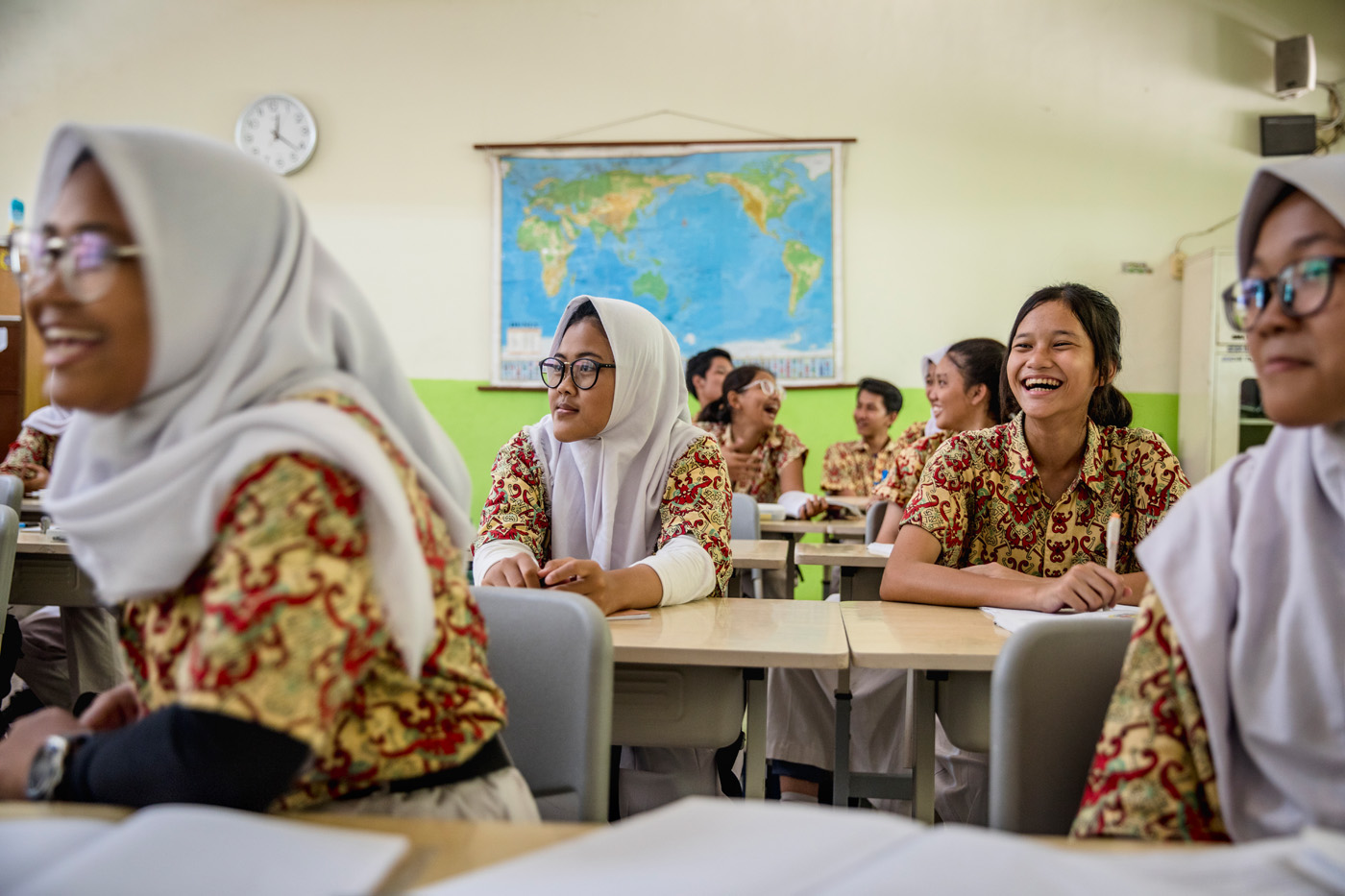I et klasserum er der gang i en biologitime, hvor eleverne klapper i hænderne og diskuterer højlydt, hvordan samfundets plastforbrug kan mindskes for at skabe renere vand i Jakartas floder.