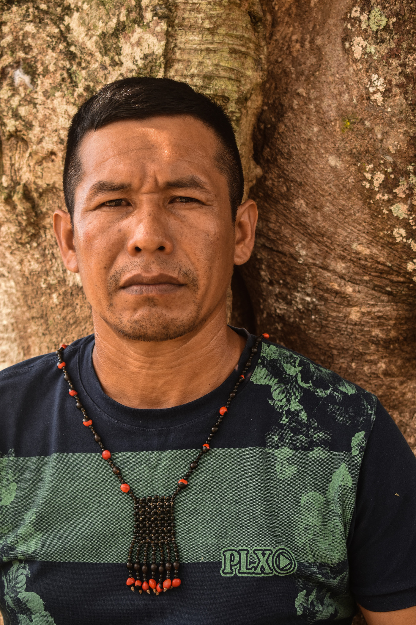 Adelson Kora Kanamari passer på sin jord. Aktivisten sidder med rank ryg og armene over kors.