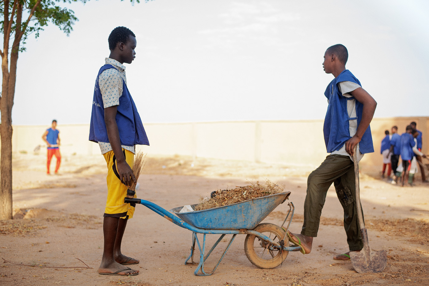 Drengenes dag starter med morgenbøn, hvorefter de skal gøre rent på fængselsarealet. Dagen fortsætter med PSF’s workshop indtil klokken ét, hvor de skal tilbage på deres eget område og tilbringe resten af dagen. På billedet: Bangis og Mubarak.