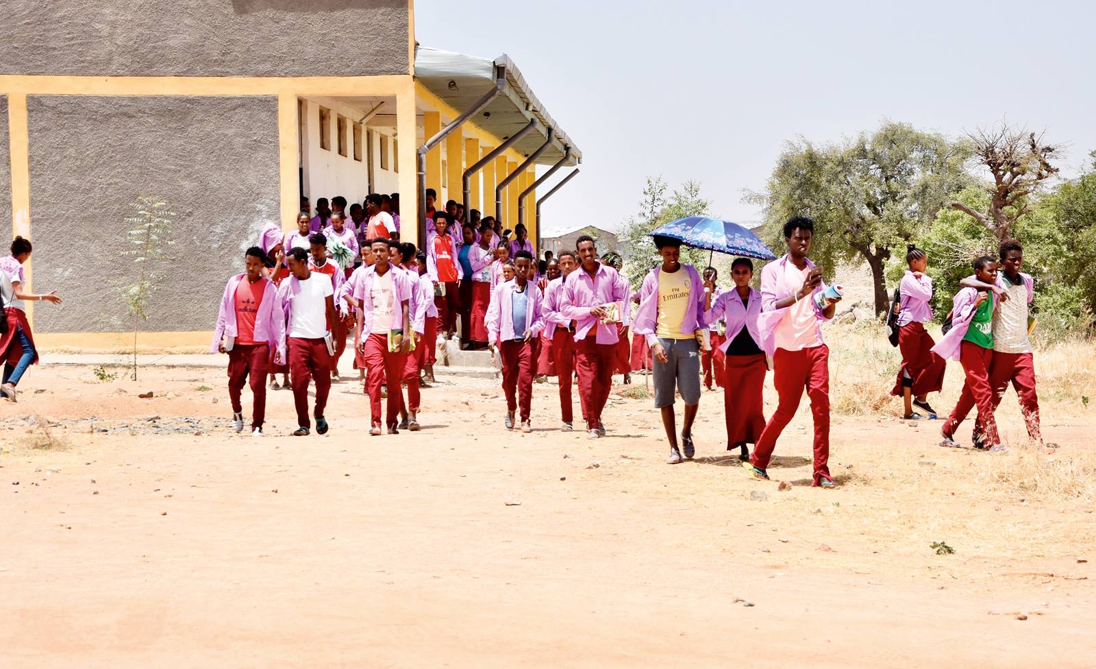 Uden for det lille overdækkede skur er markerne livgivende grønne. Plateauer er skåret skarpt ud i bjergsiderne for at udnytte arealerne bedst muligt og forhindre mudderskred i at ødelægge hele høsten, når regnen for alvor sætter ind i Tigray-provinsen i det nordlige Etiopien.