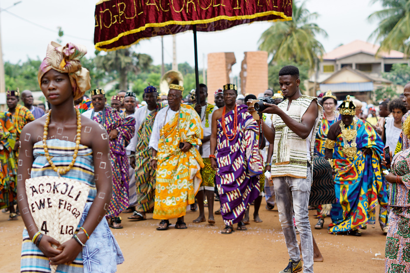 Der er ikke megen pomp og pragt over Togbui Tonou i hans hverdagstøj, som han står der i solen og kigger ud over den halvfærdige terrasse med byens larm i baggrunden. Men i morgen efter arbejde skifter han igen fra skjorte og jeans til den hvide klædedragt og kronen, da han skal til landsbyen for at deltage i en ceremoni.